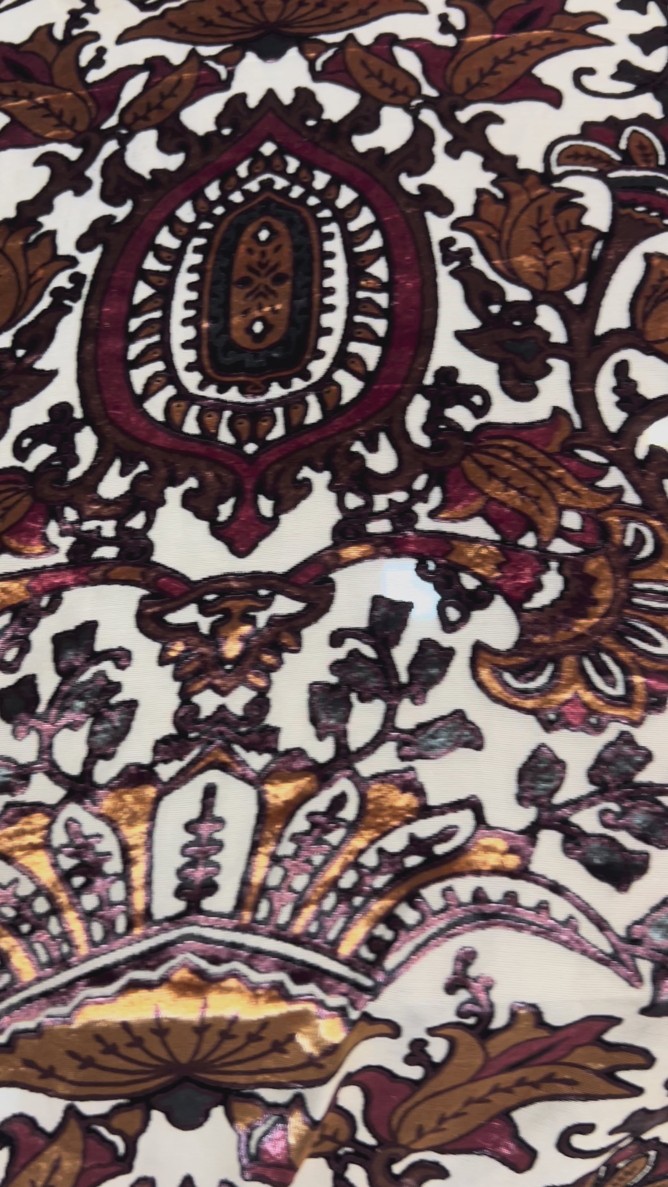 This one has a regal, heritage-inspired design. It’s a burnout velvet fabric featuring intricate motifs in deep maroon, antique gold, and bronze on a light base. The pattern looks like a fusion of Persian, Mughal, and baroque art, making it very statement-worthy.